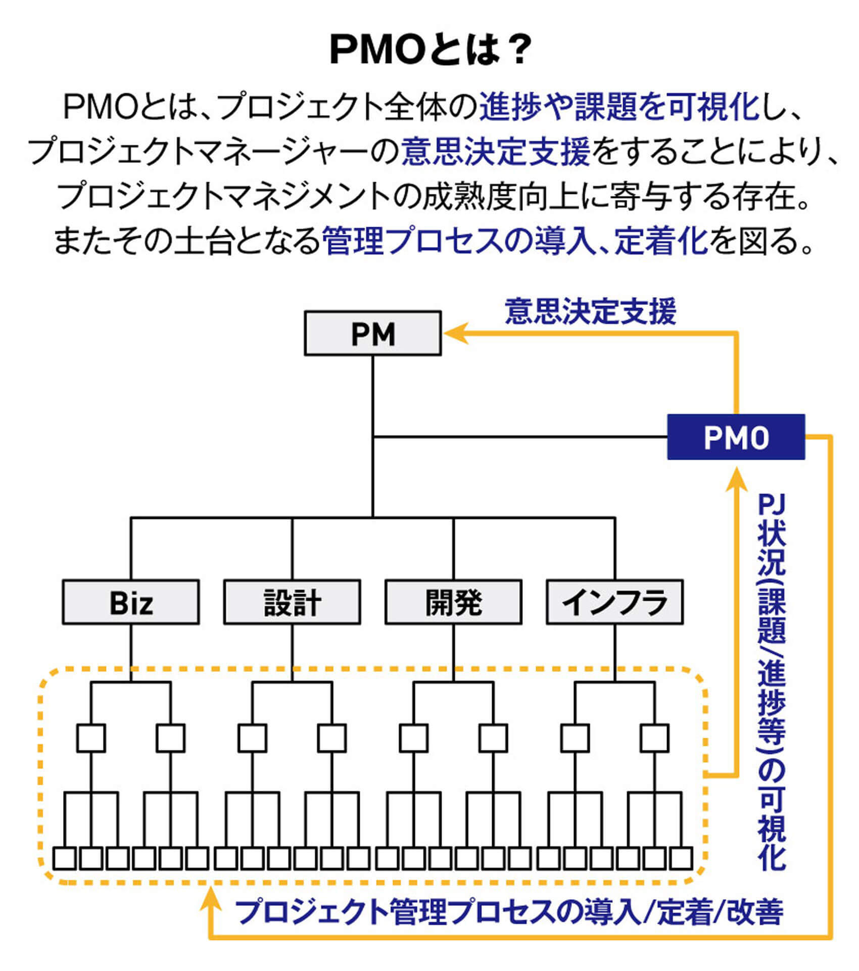 PMOは、「プロジェクトマネジメントオフィス」という言葉のとおり、プロジェクトを集中的に調整するマネジメントの組織体とされる。いわば、PMの相談相手であり、参謀といったところか。