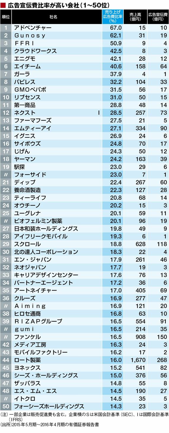 政治・経済・投資 使いすぎ?広告比率が高い200社ランキング 売り上げの半数以上を広告に投じる会社も 3分で読める 公開日時:2016/08/24 06:00 田中 久貴 東洋経済データ事業局 フォロー 1/5 PAGES 2/5 PAGES 次ページが続きます:【続いて51~100位】 3/5 PAGES 4/5 PAGES 5/5 PAGES