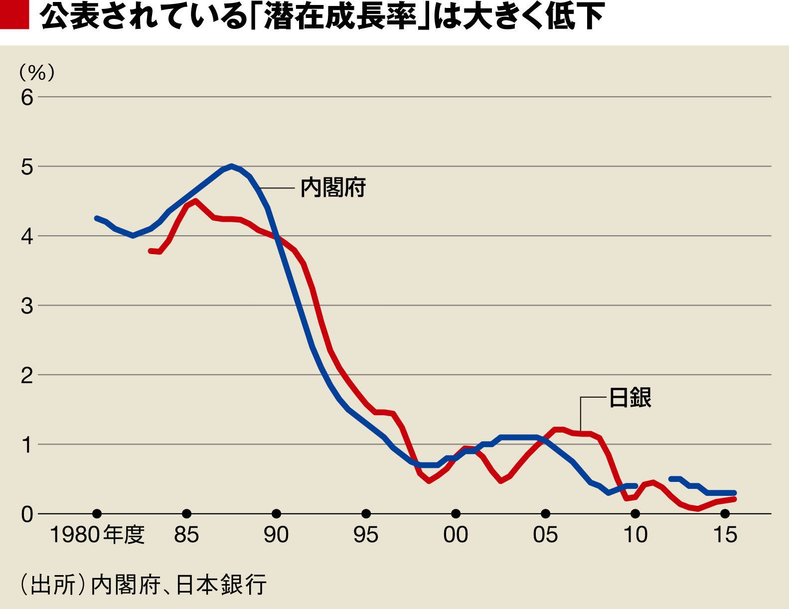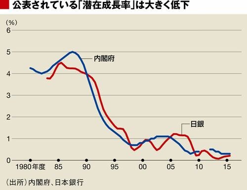 それにもかかわらず、潜在成長率が低いことが問題だという問題意識が広まったのは、内閣府と日銀が定期的に発表している日本経済の潜在成長率が非常に低いものになっていることが原因だろう。内閣府や日銀の発表している日本の潜在成長率は、1980年代後半には4%台であったが、近年では内閣府の推計で0.3%程度、日銀の推計でも0.2%程度と大きく低下している。