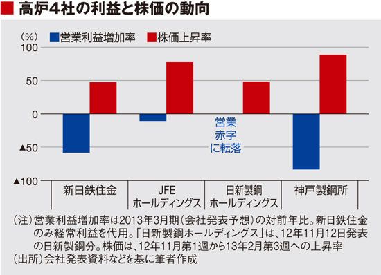 新日鉄住金の場合、通期売上高は、11年3月期の4兆1097億円から、12年3月期は4兆0909億円に減少した。今年2月発表の決算短信では、13年3月期は合併効果もあり、売上高は4兆3000億円になると予想している。しかし、経常利益は、11年3月期の2263億円から12年3月期の1430億円に減少、さらに13年3月期は600億円になると予想している。当期利益は1400億円の赤字の予想だ。それでも、同社の株価は、12年11月第1週の168円から13年2月第3週の248円へと、約5割上昇した。