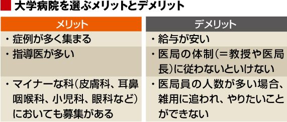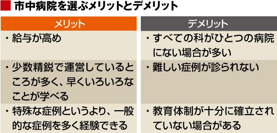 初期臨床研修と同様、この後期研修というのは大学病院や市中病院、どちらを選んでもよいのですが、ここで市中病院と大学病院では大まかに分けて以下のようなポイントがあります。