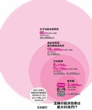 「五輪景気」を当て込んで民間の都市再開発事業も盛んになる──。こんな予想に基づく。ただ、民間3機関の試算を見ると、経済効果は6兆7780億~60兆円と差は大きい。