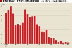 アコードはホンダの主力車種で、特に北米で人気が高く、世界的に見るとホンダの屋台骨を支えている。だが、車種の細分化が進んでいる日本では、消費者のニーズが多様化。セダンの需要は低迷し、アコードも例外ではない。1994年に7万台を超えたアコードの販売台数は、昨年2000台強とピークの3%程度の水準にまで落ち込んでしまっている。