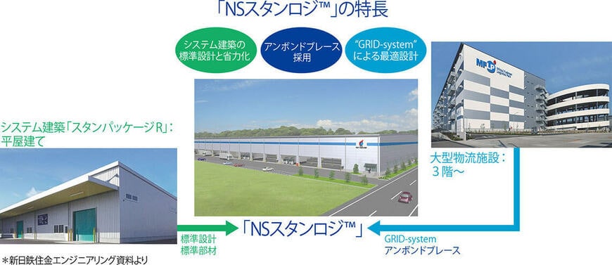 「今後、圏央道周辺で見込まれる2階建て物流施設への需要に対応するため、システム建築の新商品『NSスタンロジ』を開発しました。大きなポイントの一つとして、当社の大型物流施設で採用している耐震・制振部材『アンボンドブレース』を2階建て建屋に適用し、建物の鋼重量を大幅に削減することに成功した点が挙げられます」。