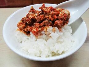 ご飯の上に、豆腐を救出してみると、豆腐の旨さに驚く! 代々木上原で創業83年の太田屋豆腐店から仕入れた木綿豆腐を一晩水切りして使用している。「麻婆豆腐」は豆腐を味わう料理! それを物語る味に感動を覚える。