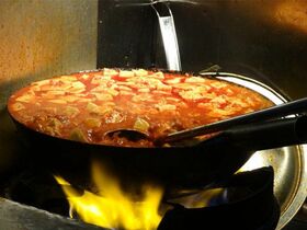 それにしても何なのだ、この赤さは。聞けば、豆板醤だけでなく輪切りの唐辛子と大量の一味唐辛子を入れている。厨房で上がる炎、刺激的な唐辛子とむせる花椒に葛藤する店主を見ていると、なぜそこまでやるのかと心配になる。