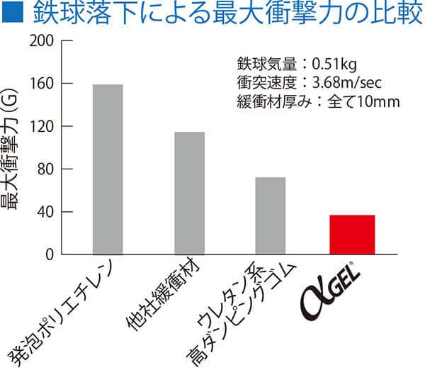「αGEL」の柔らかさは、ビルの6階相当から生卵を落下させても、わずか2センチメートルの厚みのシートによって卵を割ることがなくピタリと静止できるほど。