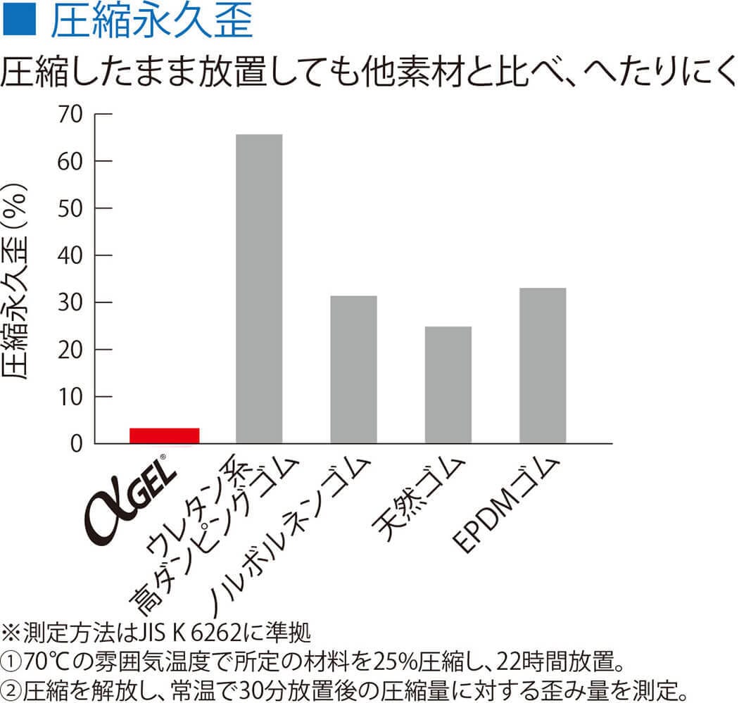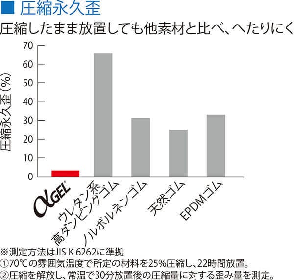 さらに、「αGEL」は耐久性にも優れている。耐オゾン性、耐紫外線性、耐薬品性などに優れ、圧縮永久歪(ひずみ)が小さく、繰返し圧縮しても性能の変化はほとんど見られない。また、温度依存性が少なく、マイナス55〜200℃の幅広い温度条件下で安定した性能を発揮する。