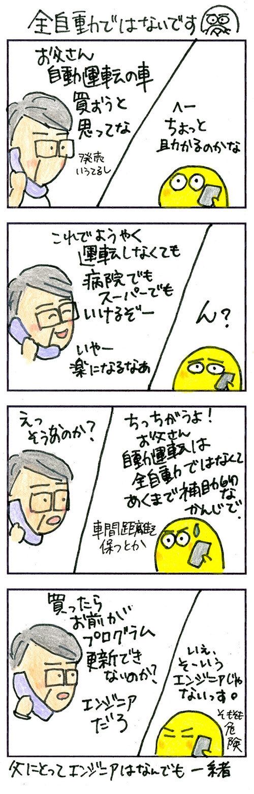 それに、ぼへちゃんはWeb系のエンジニア。自動運転とは分野が違います。でも、お父さんにとってはエンジニアはみな一緒なようです。お医者さんの世界にも内科や外科といった専門があるように、エンジニアにも専門分野があります。その辺のことは理解してほしいものです。