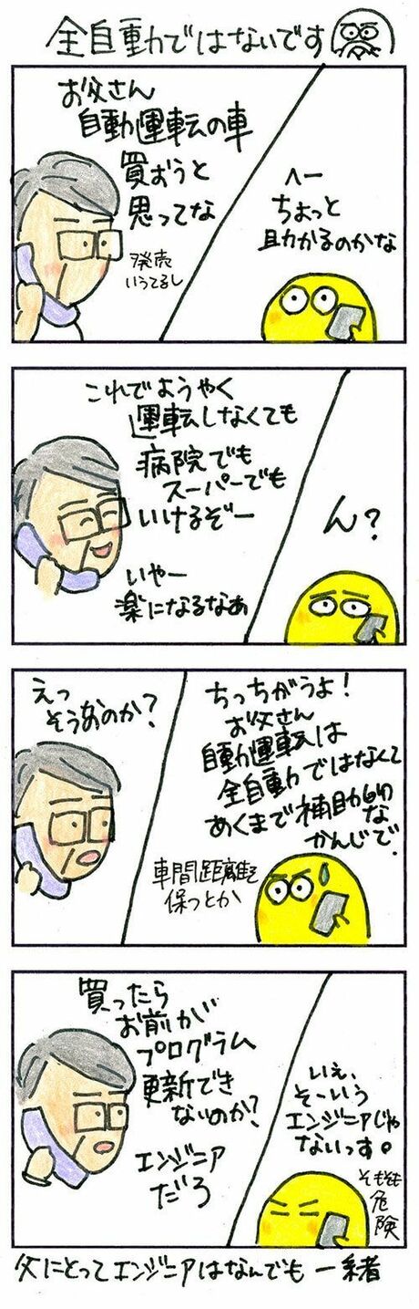 地方での生活にはクルマは必須。スーパーやドラッグストアなども歩いて行ける距離にはないので、ぼへちゃんのお父さんも買い物にはクルマを使っています。ですが、年を取るごとに目も悪くなり、クルマの運転もだんだんしんどくなってきた様子。そこで自動運転のクルマを購入するつもりのようです。