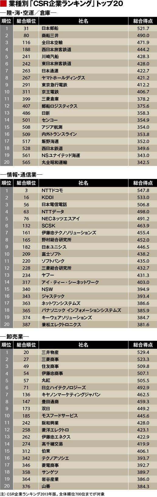 情報・通信業トップのNTTドコモ(547.8点)は非製造業で初の総合トップ3入り。財務以外はほとんど遜色のない2位KDDI(533.0点)も後に続くことができるか注目だ。以下、3位日本電信電話(506.8点)、4位NTTデータ(498.0点)。11位のソフトバンク(435.0点)は総合で昨年427位から220位へと急上昇した。CMでおなじみの電波改善同様、ライバル2社に追いつけるか。