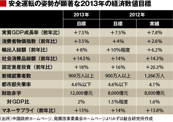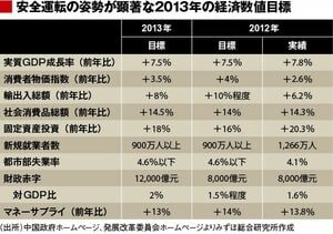 マクロ経済運営についてみると、2013年の実質GDP成長率の目標値は+7.5%と前年と同水準に設定された(表)。