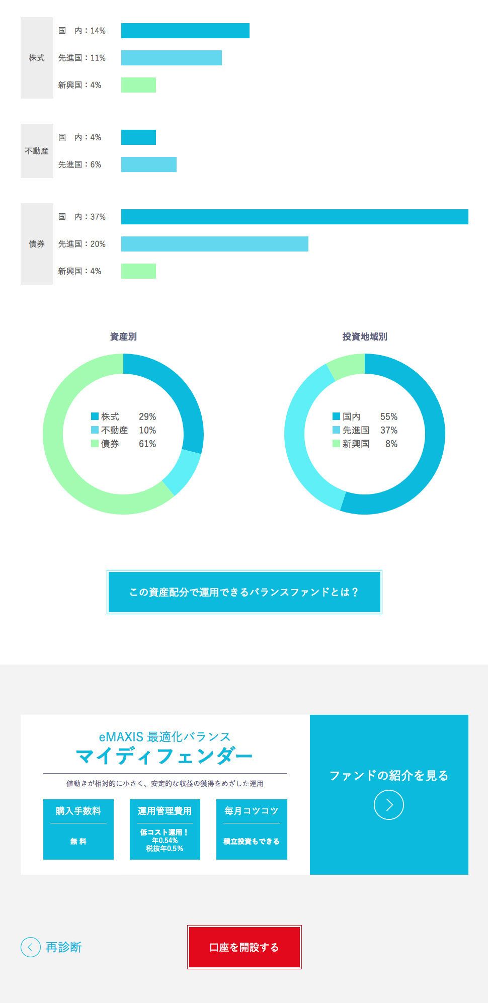 質問の回答から、例えば「勝って兜の緒を締める」といったタイプ別のリスク許容度が診断され、それぞれの顧客に合った資産配分のファンドを選び出す流れになる。