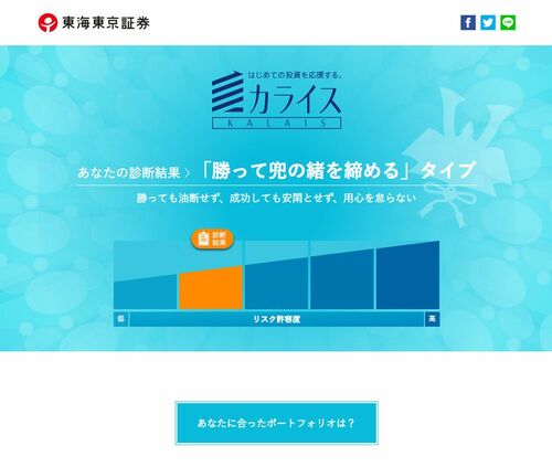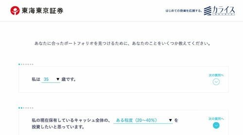 東海東京証券がスタートさせた「カライス」は、インターネット上で7つの質問に答え、その回答から導き出される「リスク許容度」をもとに、適切なバランス型投資信託(ファンド)を提案・購入できるという機能をもつ。リスク許容度とは、投資の際にどれだけ価格の上下を受け入れるかの幅だ。