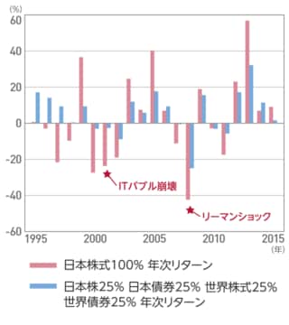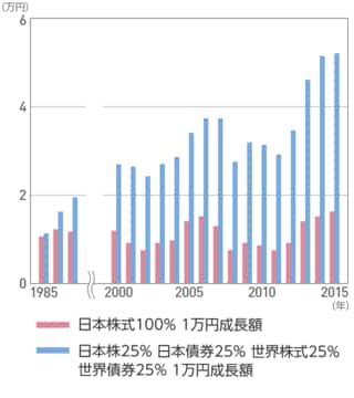 例えば、下図は、仮に1万円を投資した場合、それが過去20年間どのように成長したかを簡易的に表したものだ。日本株式100%と投資対象を分散させた場合の比較推移だ。(*)