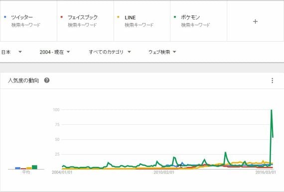 グーグルトレンドで、ポケモン(pokemon)を検索してみると2016年7月に極端なハネ上がりを見せています。