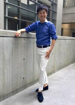 チノパンといえば、そのワークテイストからカジュアルな印象に捉えられがち。だからこそ、定番色であるベージュより、白いチノパンがビジネスファッションに向いていると私は考えています。木くずなど汚れが目立ちにくい定番色ベージュのチノパンには、どうしてもカジュアルなイメージを連想するでしょう。一方、下半身に汚れやすい白色をあえて持ってくるその余裕が、チノパンであっても相手に清潔感をイメージさせます。