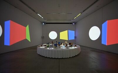 『モノ・オトと映像の部屋』は、部屋をぐるりと囲む壁に「まるとしかく」「デザインかぞえうた」などの映像が映し出され、小山田圭吾による心地よい音楽が流れる。音と映像に包まれて、日常のいろいろなところにデザインがあることを体感できる。