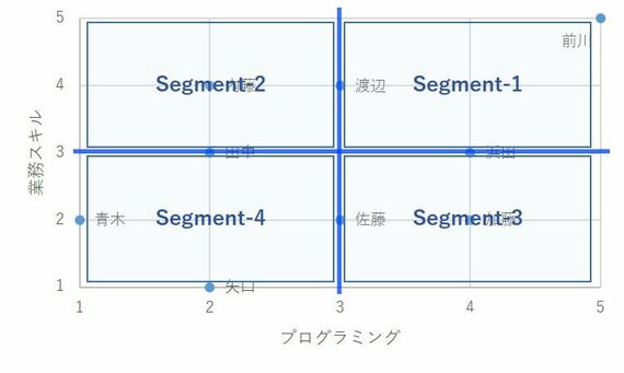 右上にあるエリアは総合スキルが高く、逆に左下は総合スキルが低いということを示しています。とはいえ、単純に全員が右上に行けばいいというものではありません。もちろん右上にのみ固まればいいですが、それには人材育成のための時間がかかってしまいます。そこで、2本の線でセグメント分けをして、チーム力を最大化するための作戦を考えていくのです。