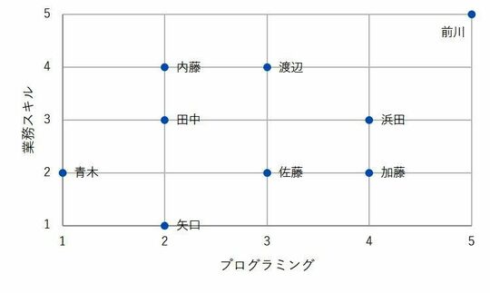 このマトリクスでは、横軸をプログラミングスキル、縦軸を業務スキルに設定し、メンバーのスキルを可視化しました。