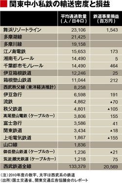 この通過数量と同等の規模感を持つ関東の中小私鉄の損益と比べることで、採算ラインを読み取ることができるだろう。表には関東の中小私鉄会社の鉄道事業の損益を明記した(あくまでも鉄道事業のみの数字。鉄道会社はバス事業や不動産事業も行っており、企業全体の業績とは異なる)。