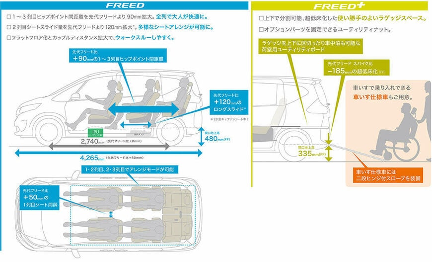 新型フリードは福祉車両が充実していることも特徴だ。現在開催中のリオデジャネイロ・パラリンピックに合わせたつもりはないだろうが、フリードには助手席リフトアップ6人乗りと2列目左側サイドリフトアップの4人乗り、フリード+は2列シート5人乗りの後方に車いすのままスロープで乗り降りできる6人乗りがある。