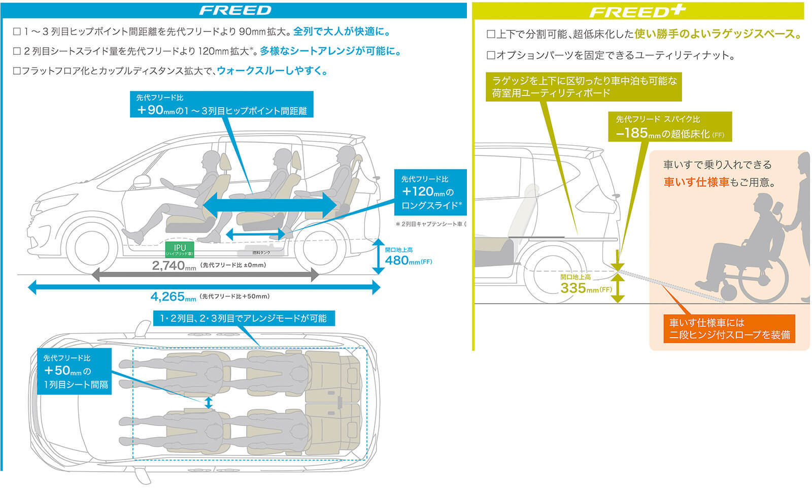 次にパッケージングでは、バッテリーなどを内蔵したハイブリッド車用機器IPU(インテリジェント・パワーユニット)を旧型より55mm短くし、3列目下から前席下に移動したことが目立つ。その結果、ハイブリッドと4WD、ハイブリッドと車いす仕様の組み合わせが可能になった。ハイブリッド4WDは、シエンタにはない仕様だ。
