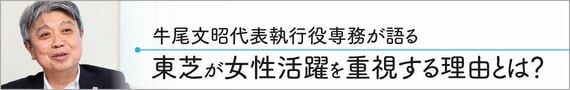 そうした情勢下、いち早く、女性活躍、そしてダイバーシティ推進に取り組んできたのが東芝だ。東芝がダイバーシティ推進に取り組み始めたのは2004年。女性役職者の登用、女性が働きやすい職場づくりなどの施策を推し進めてきた東芝の取り組みとは一体どのようなものなのか。今回、現場の第一線で働く女性役職者に東芝の社風、職場の働きやすさ、キャリアプランなどについて語ってもらった。ダイバーシティ推進の責任者である牛尾文昭東芝専務へのインタビューと合わせてご紹介する。