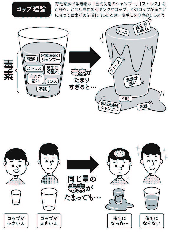 薄毛になりやすい人はコップが小さく、薄毛になりにくい人はコップが大きいだけなのです。つまり、毒素をたくさん浴びてしまえば、誰でも薄毛になります。これを私は「コップ理論」と呼んでいます。