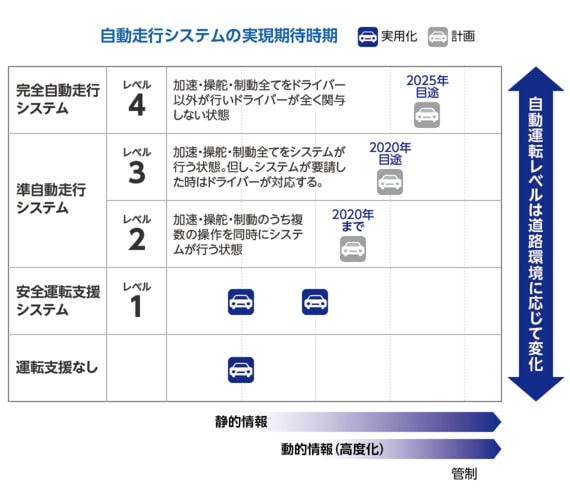 自動運転を巡る技術開発競争は、アクセル、ハンドル、ブレーキのどれか1つをクルマが担う「安全運転支援」から、それらの機能の複数を担う「準自動運転」へと主戦場が移りつつあります。いずれは、人間による運転操作をまったく必要としない「完全自動運転」も実用化されるはずです。