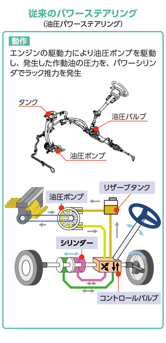 それ以前にあった油圧式のパワーステアリングは、運転中に油圧ポンプを駆動し続けなければなりません。ポンプを動かすにも燃料が必要で、その分だけ燃費を押し下げるのが難点でした。一方のEPSは、電気の特性上、必要なときだけオンデマンドでモーターを駆動することができます。油圧ポンプの待機分の燃料が不要になった分だけ燃費が向上し、パワーステアリングの主流はEPSに移っていきました。