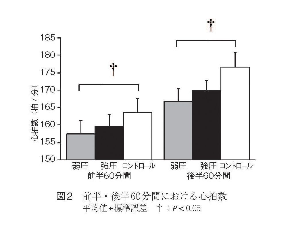 このことから、研究論文では、下肢筋群の筋肉疲労の軽減や、心拍数の上昇抑制、炎症反応の抑制には、“弱圧が有効”だと結論付けています。