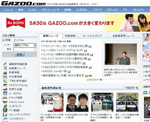 トヨタは4月26日、同社が運営する自動車に関連するさまざまな情報・サービスを提供する総合サイト「GAZOO.com(ガズー・ドット・コム、=タイトル下写真はトップページ=)」を5月30日にリニューアルすると発表した。