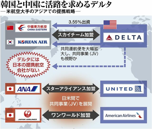 デルタが米国で競合する、ユナイテッド航空とアメリカン航空は、それぞれANA、JALと共同事業を展開している。