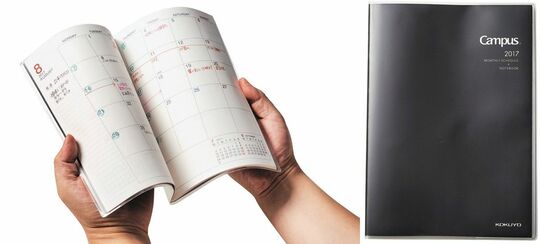 コクヨの「キャンパスダイアリーノート」(マンスリー・ノート多数枚タイプ¥1000)は、ベストセラーであるキャンパスノートのダイアリー版。軽い・薄い・柔らかいと三拍子が揃っている。