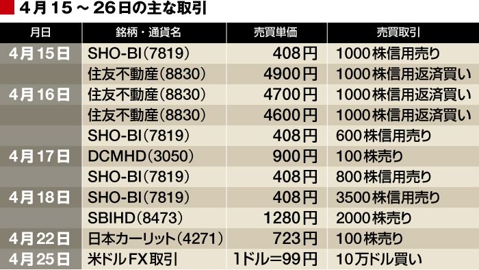 9時27分、住友不動産を4600円で信用返済買いし、手数料と逆日歩の1930円のマイナス。信用売りは4月5日に4800円と4600円で各1000株ずつ。これで住友不動産のポジションはなくなり、4月4日に90万円の損失を出したが、住友不動産の売買トータルとしては、約マイナス20万円と縮小した。12時58分、SHO―BIを408円で600株信用売り。日経平均は一時1万3000円まで下落したが、引けで戻して54円安の1万3221円と3日続落。