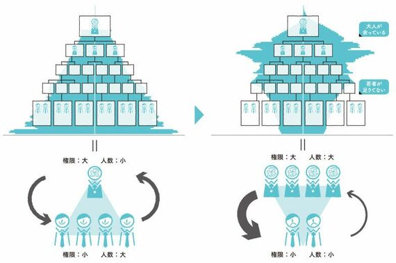 左が1950年の日本の人口動態に、一般的な年功序列型の組織図をプロットしたものです。右が2015年のそれに、同じく組織図をプロットしたものです。年功序列という組織思想自体の賛否や良しあしについてはここでは触れませんが、その思想には「年長者になるにつれ、人数が少しずつ少なく構成されている組織」という前提があります。年長者は権限が大きい代わりに数が少なく、ひるがえって若手は権限が少なくとも数は多い。このパワーバランスの均衡が、意志決定の世代間の偏りを少なく保っていたのではないでしょうか。