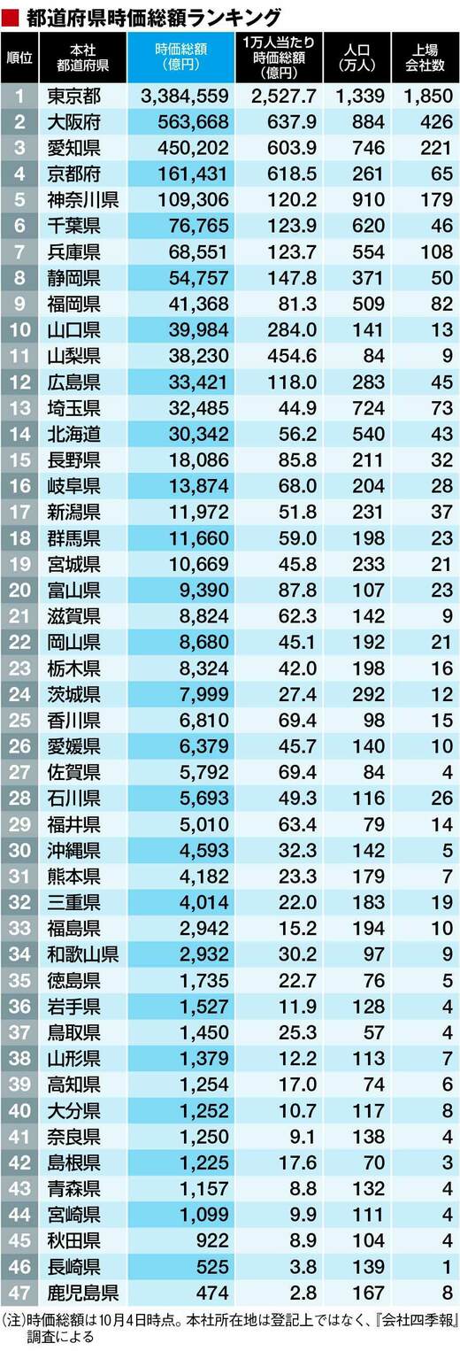 政治・経済・投資 意外!「都道府県の企業時価総額」ランキング 山口と山梨が上位、鹿児島が最下位のワケ 2分で読める 公開日時:2016/10/09 06:00 丸山 尚文 東洋経済 記者 フォロー 1/2 PAGES 2/2 PAGES