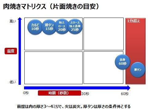 「横軸」に秒数、「縦軸」に温度の高低を軸にした肉焼きマトリクスを作成してみました。カルビなら温度高めに片面10秒、厚タンなら温度は低めで片面1分超え――などといった具合です。