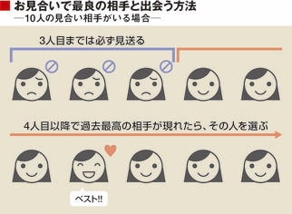 実は、この問題の正解は「3人」であることが明らかになっている。算出方法の詳細には触れないが、3人目までは見送って、4人目以降、それまで出会った相手の中でベストな人が現れたら結婚する、というのが、この場合の最適戦略なのだ。