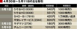 10時13分、540円(前日比20円高)で1000株売り、10時21分、551円で1000株売った。買いは、2011年1月26日に公募価格の440円で2000株。20万3368円の利益確定。