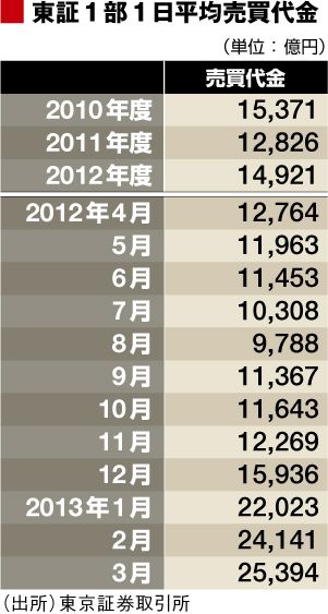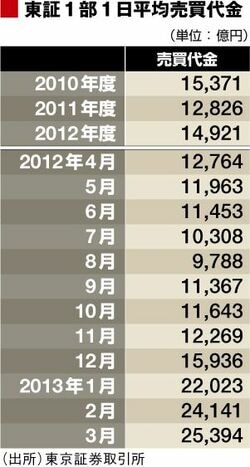 ここで、株式市場の動きを見てみましょう。東証1部の「1日平均売買代金」右表)は、昨年末までは1兆円前後で推移していたのが、今年に入ってから2兆円を大きく超える水準まで急増しています。