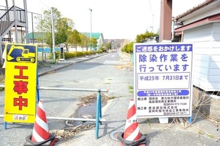 富岡町小浜の交差点を右折するとJR常磐線富岡駅前に通じる道が延びている。道路の左側に位置する富岡第一中学校の前では除染作業が始まっていた(写真⑦)。
