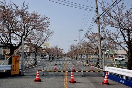 同区域に通じる道には至るところに「開閉式バリケード」)や「H鋼バリケード」が設置されており(写真⑩)、桜で名高い夜ノ森公園にたどりつくことはできなかった。