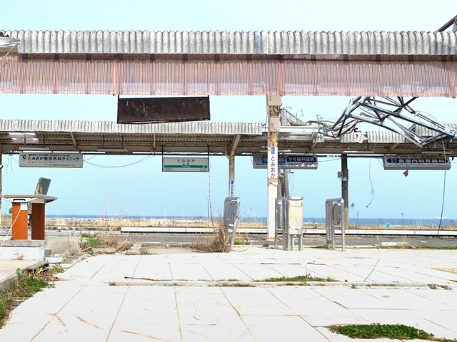 富岡駅にも津波が押し寄せ、構内の鉄柱はひしゃげて無惨な姿をさらしていた(写真⑨)。