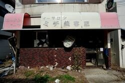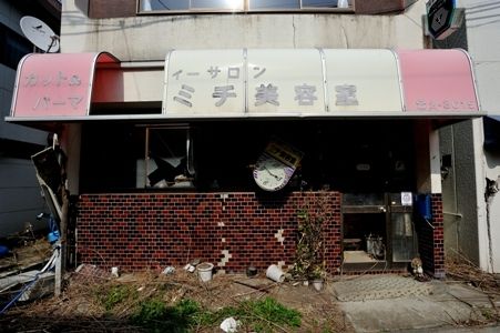 富岡町は津波被害の大きさでも際立っていた。駅に向かう道の脇には津波に飲まれてひっくり返ったままの自動車が放置され、美容院の看板は大地震が起きた2時46分のままになっていた(写真⑧)。