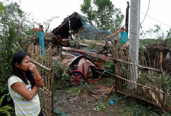 10月21日、非常に勢力の強い台風22号に見舞われたフィリピンの当局は21日、少なくとも12人が死亡し、多くの水田やトウモロコシ畑が冠水したと明らかにした。写真は台風で被害にあった自宅の前で立ちつくす女性。フィリピンの北イコロス州で20日撮影(2016年 ロイター/Erik De Castro)