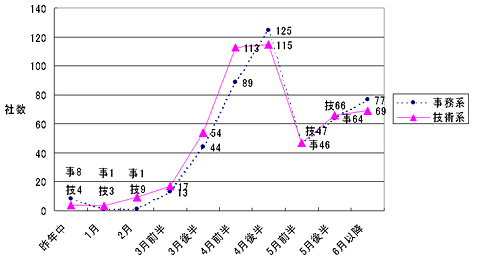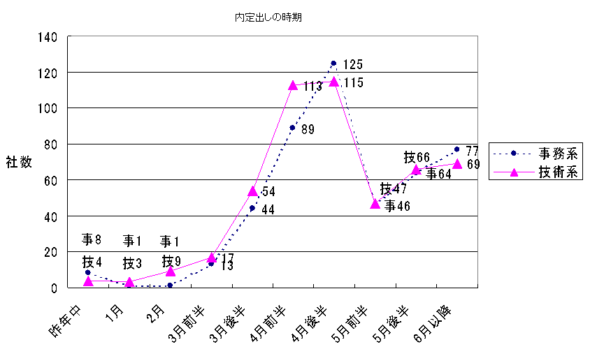 同時期に事務系と技術系に差がついているのは、メーカーが技術系の選考を固めてから、事務系の選考に移行するタイムラグが若干影響していることによるものだ。