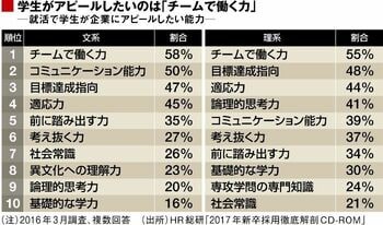 こちらは、文系学生と理系学生では傾向が異なるため、分けて集計してみたが、1位は文理ともに「チームで働く力」となっており、6割近い学生が挙げている。企業側の結果でも「チームで働く力」は2位に入っており、それをアピールすることは悪いことではない。企業は個人プレーというよりは、多くの場合、組織で活動するものであり、チームワークは極めて重要な要素となっている。