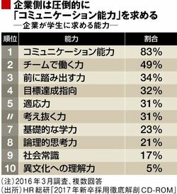 「求める人物像」は各企業によって異なるものの、そのベースとなる能力は多くの企業で共通している。HR総研の調査データ「2017年新卒採用徹底解剖」の中から、「企業が学生に求める能力」の結果を見ると、断トツの1位は「コミュニケーション能力」で、実に83%もの企業が求める能力として挙げている。2位の「チームで働く力」ですら49%と半数を切っており、「コミュニケーション能力(コミュ力)」がいかに重要とみなされているかがわかるだろう。